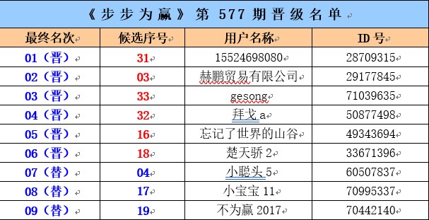 《步步为赢》第577期晋级名单公布