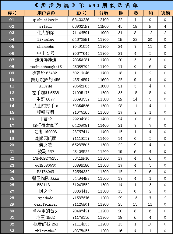 经过一周的激烈角逐,《步步为赢》第643期网络海选的33名候选选手已经揭晓。