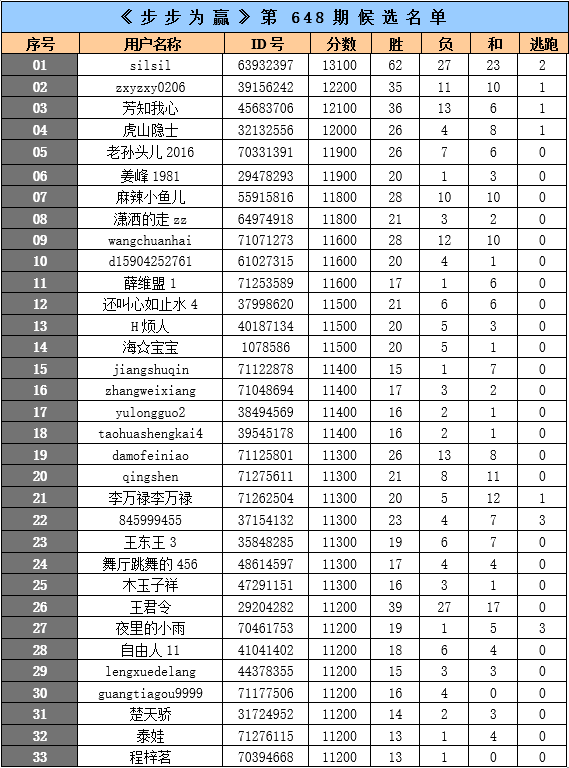 经过一周的激烈角逐,《步步为赢》第648期网络海选的33名候选选手已经揭晓。