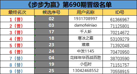 《步步为赢》第690期晋级名单公布