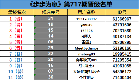 《步步为赢》第717期晋级名单公布