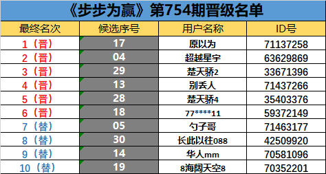 《步步为赢》第754期晋级名单公布
