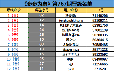 《步步为赢》第767期晋级名单公布
