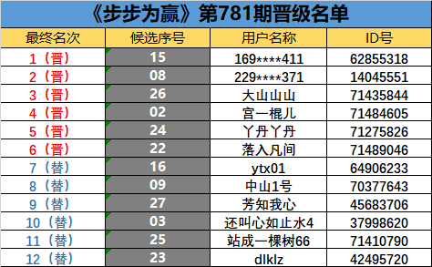 《步步为赢》第781期晋级名单公布