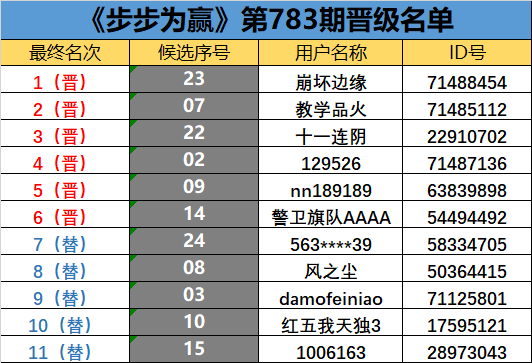 《步步为赢》第783期晋级名单公布