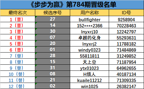 根据2023年5月11日中国福利彩票“双色球”玩法第23053期开奖结果,《步步为赢》第784期选手晋级名单已经产生。