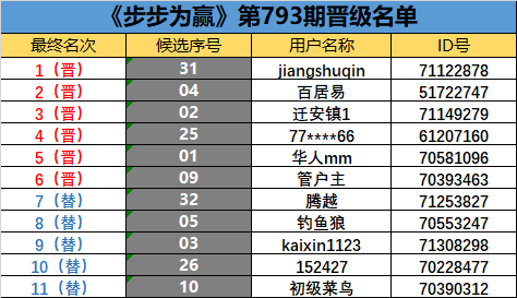 《步步为赢》第793期晋级名单公布