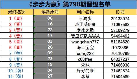 《步步为赢》第798期晋级名单公布