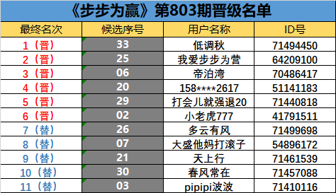 《步步为赢》第803期晋级名单公布