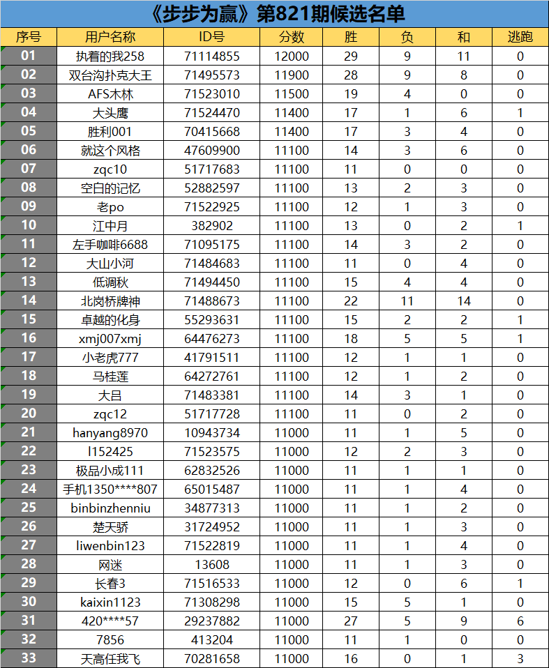 经过一周的激烈角逐,《步步为赢》第821期网络海选的33名候选选手已经揭晓。