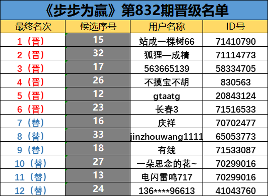 《步步为赢》第832期晋级名单公布