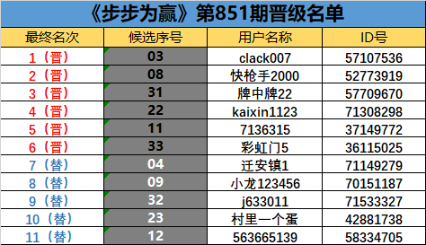 《步步为赢》第851期晋级名单公布