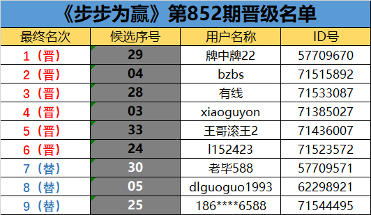 《步步为赢》第852期晋级名单公布