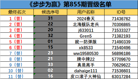 根据2024年10月10日中国福利彩票“双色球”玩法第24116开奖结果,《步步为赢》第855晋级名单已经产生。