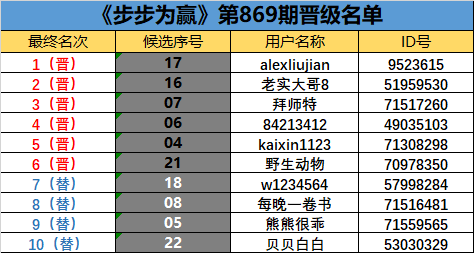 《步步为赢》第870期晋级名单公布
