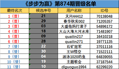 《步步为赢》第874期晋级名单公布