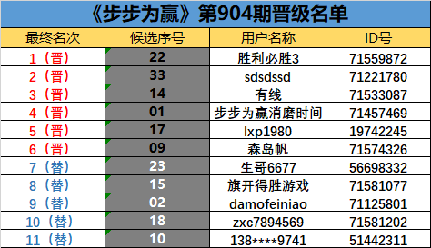 《步步为赢》第904期晋级名单公布