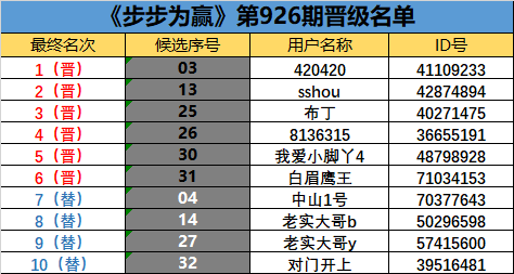 《步步为赢》第926期晋级名单公布